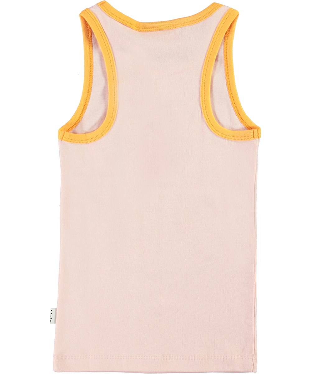 Gaaf lichtroze hemd met skate smiley in fuchsia-roze op voorkant. Bies langs de mouwen en hals in okergeel.